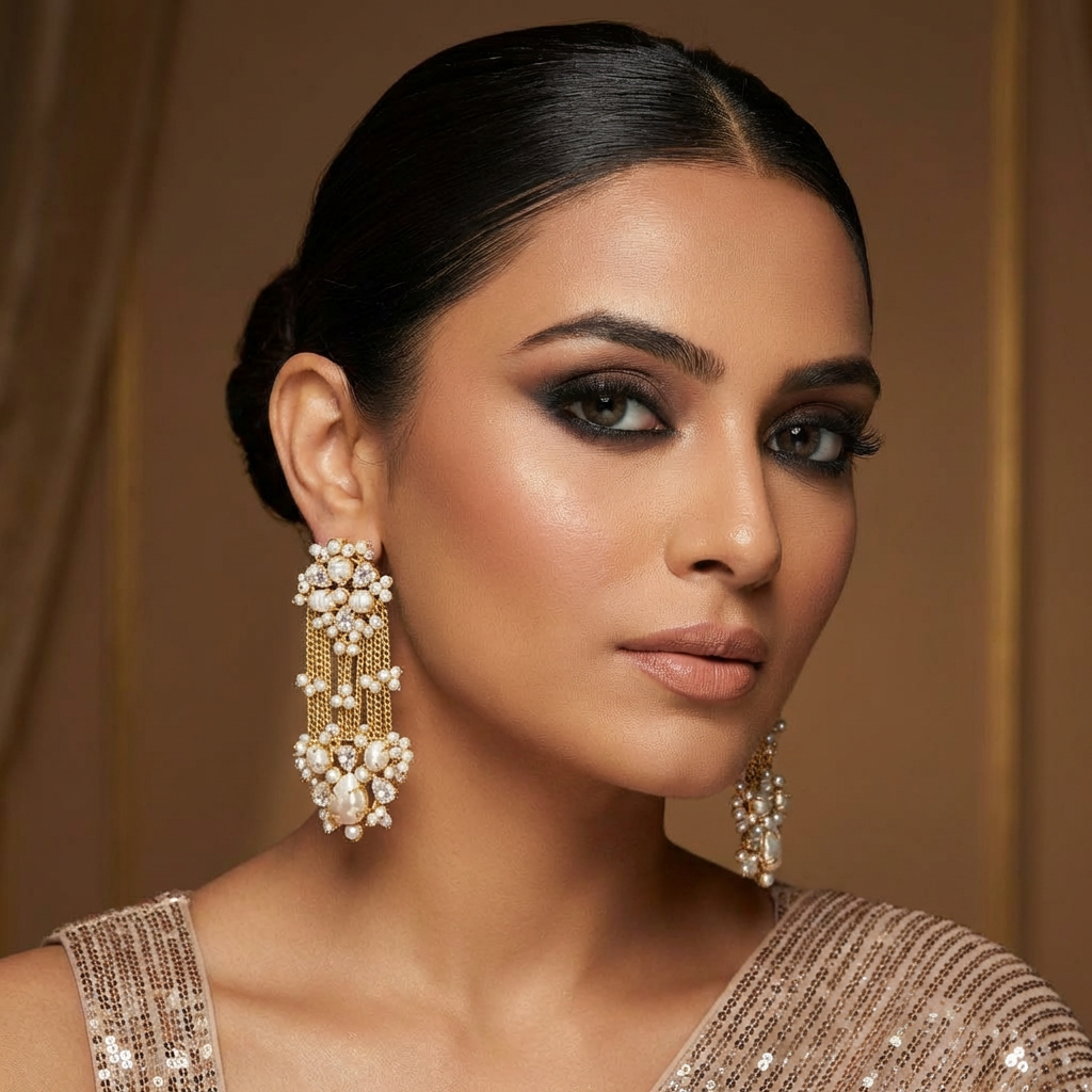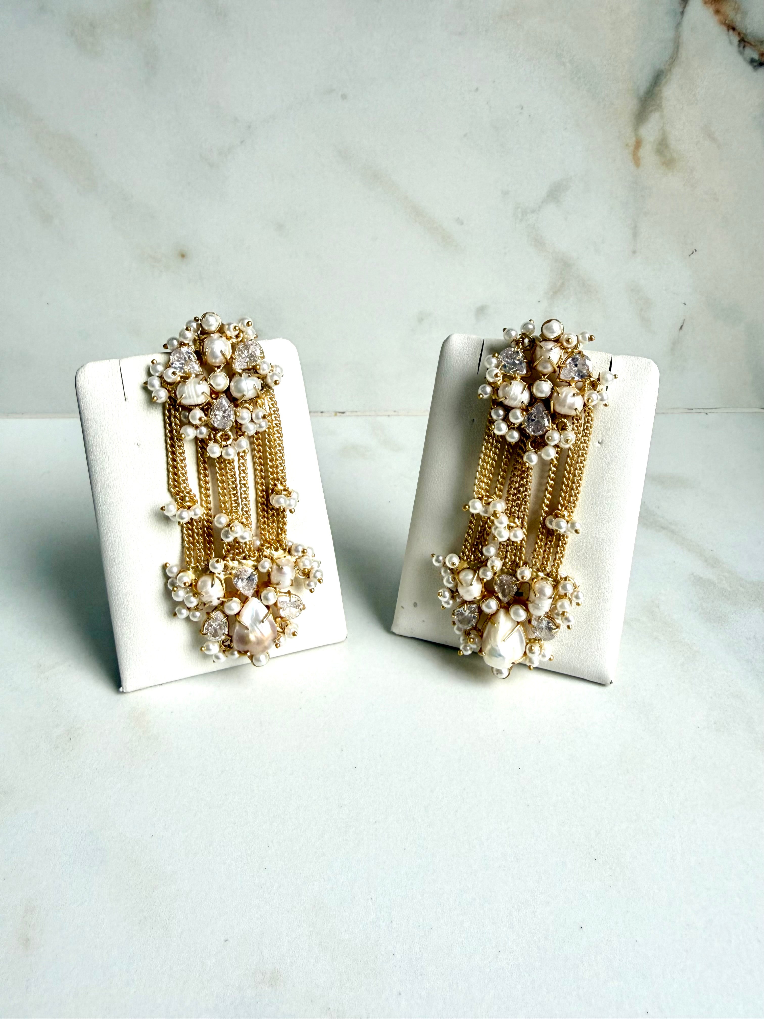 Bold and elegant, the Zehra Pearl Cascade Earrings feature rich pearl stones framed with sparkling crystals and clusters of delicate pearls. The layered gold-toned chains create a graceful cascading effect, adding movement and drama to the design. Handcrafted to perfection, these earrings are ideal for weddings, festive celebrations, and bridal functions, making them a striking statement piece for traditional ensembles.