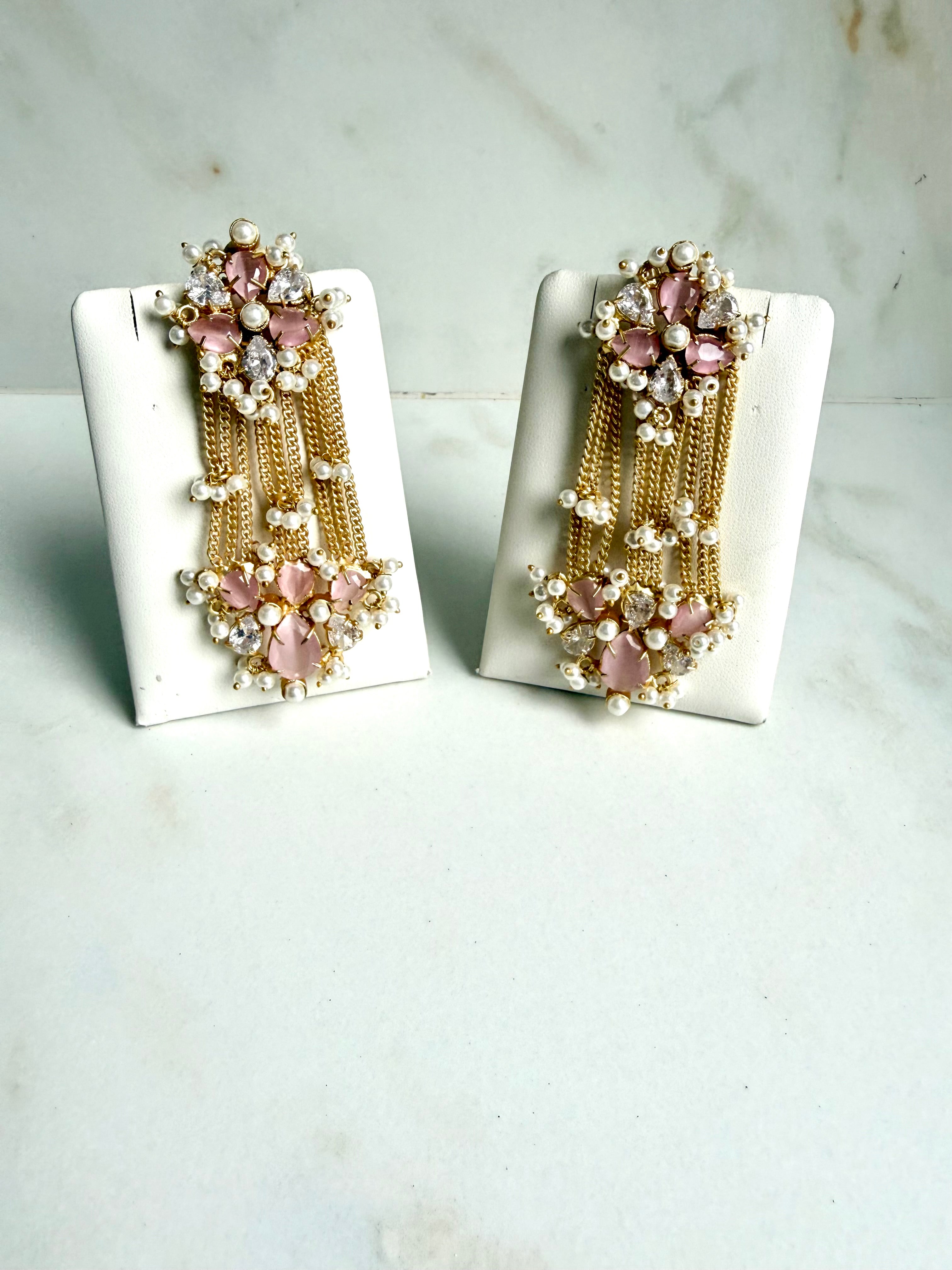 Bold and elegant, the Zehra Pink Cascade Earrings feature rich pink stones framed with sparkling crystals and clusters of delicate pearls. The layered gold-toned chains create a graceful cascading effect, adding movement and drama to the design. Handcrafted to perfection, these earrings are ideal for weddings, festive celebrations, and bridal functions, making them a striking statement piece for traditional ensembles.