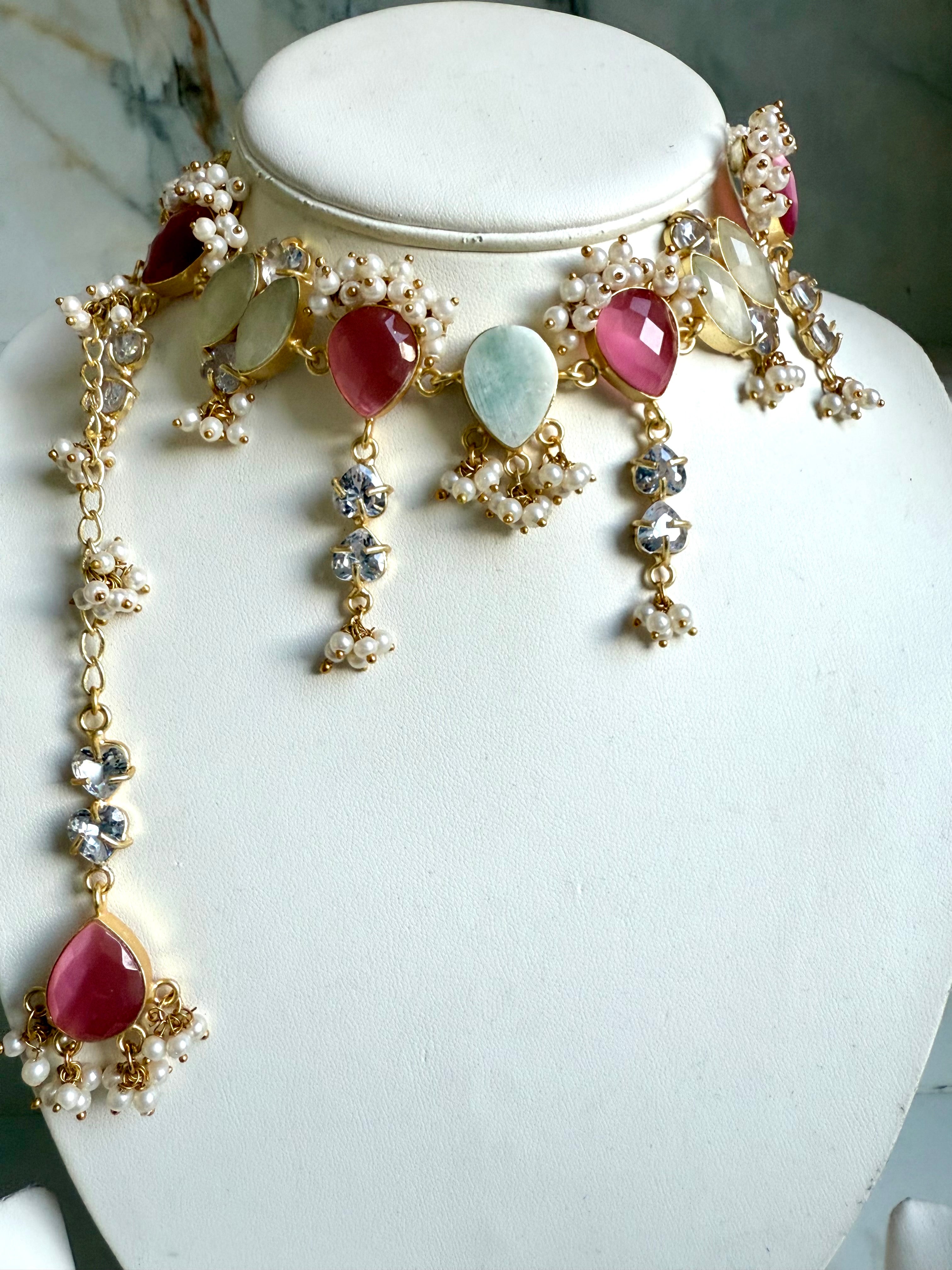 This Rajkumari pink Set features a stunning crystal design that will add a touch of elegance to any outfit. Made with high-quality materials, it offers a sparkling and eye-catching look. Perfect for special occasions or adding a touch of glamour to your everyday wear.