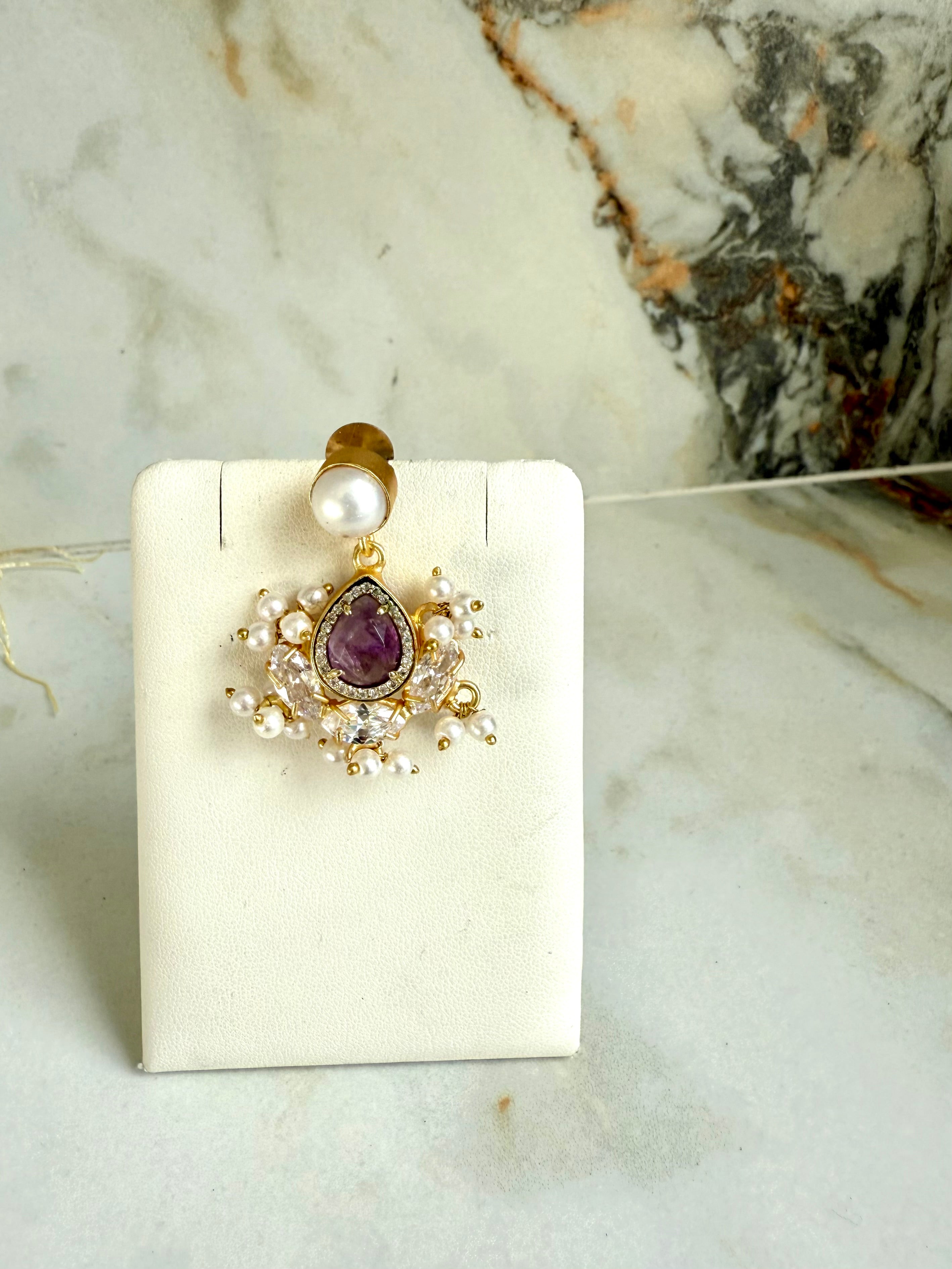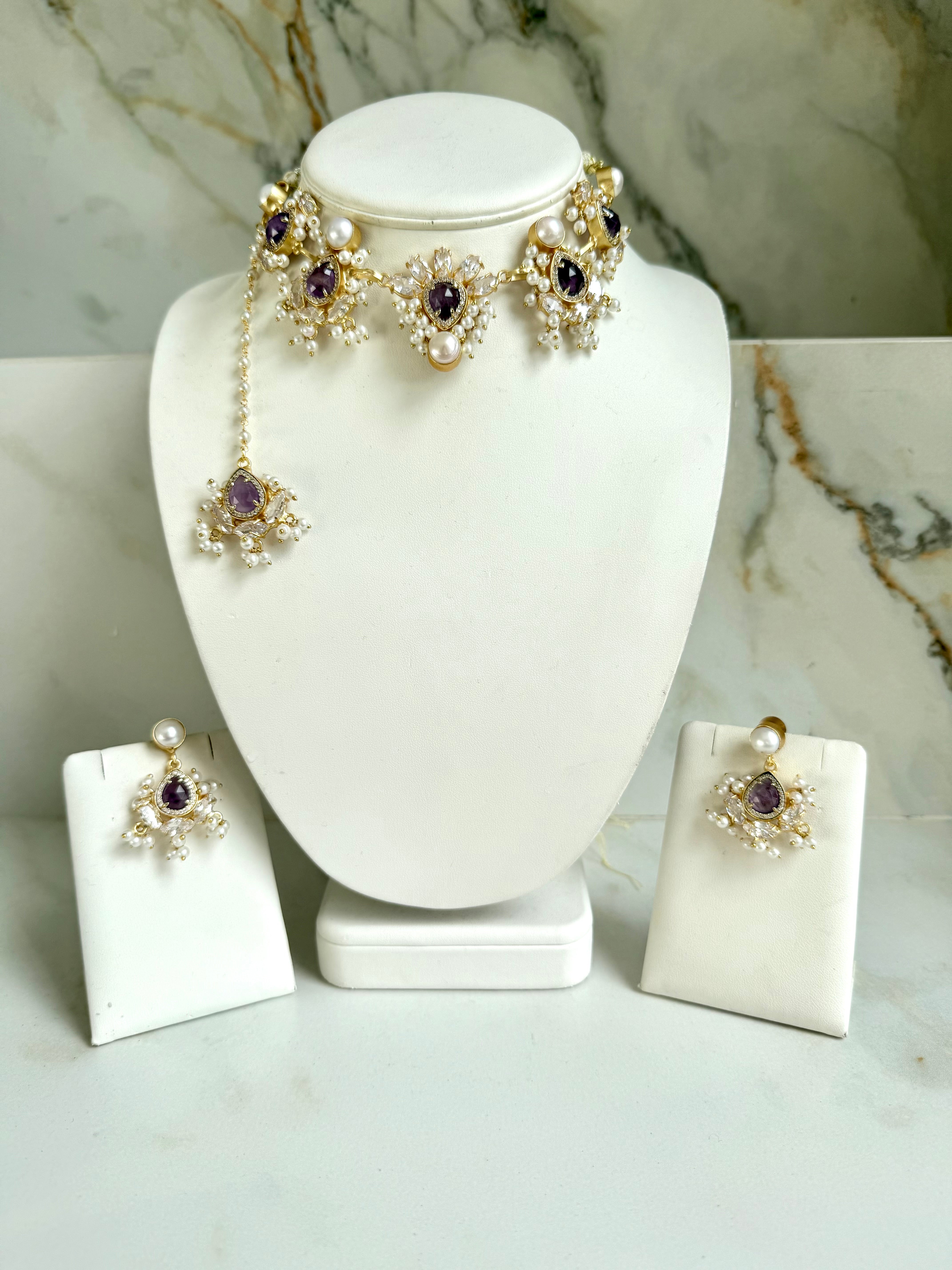 Step into the freshness of spring with Aabroo-E-Bahar, a delicate choker set that celebrates grace, lightness, and renewal. Adorned with soft purple stones, and luminous pearls, each element is framed in a radiant gold finish and accented with petite pearl clusters.