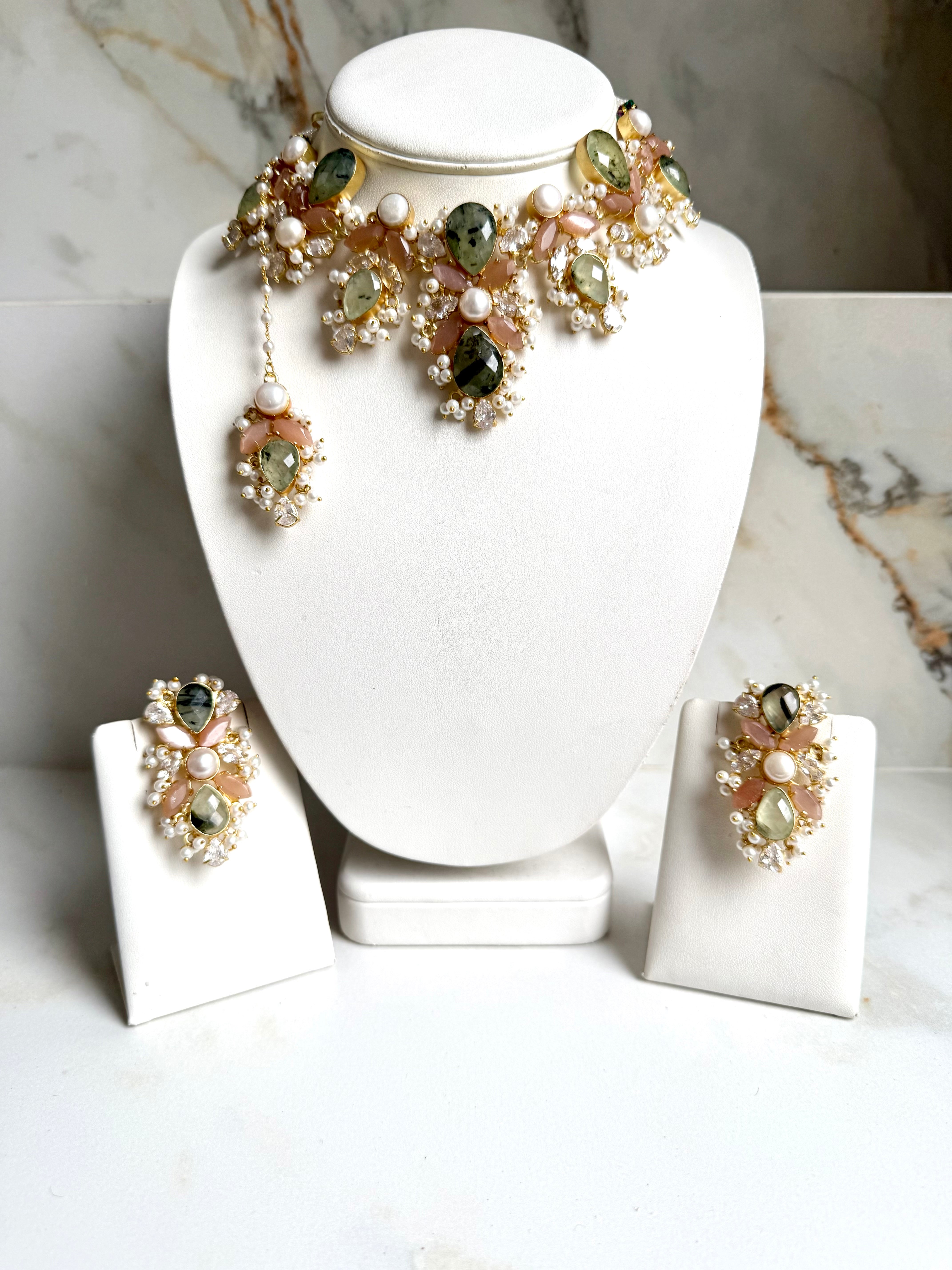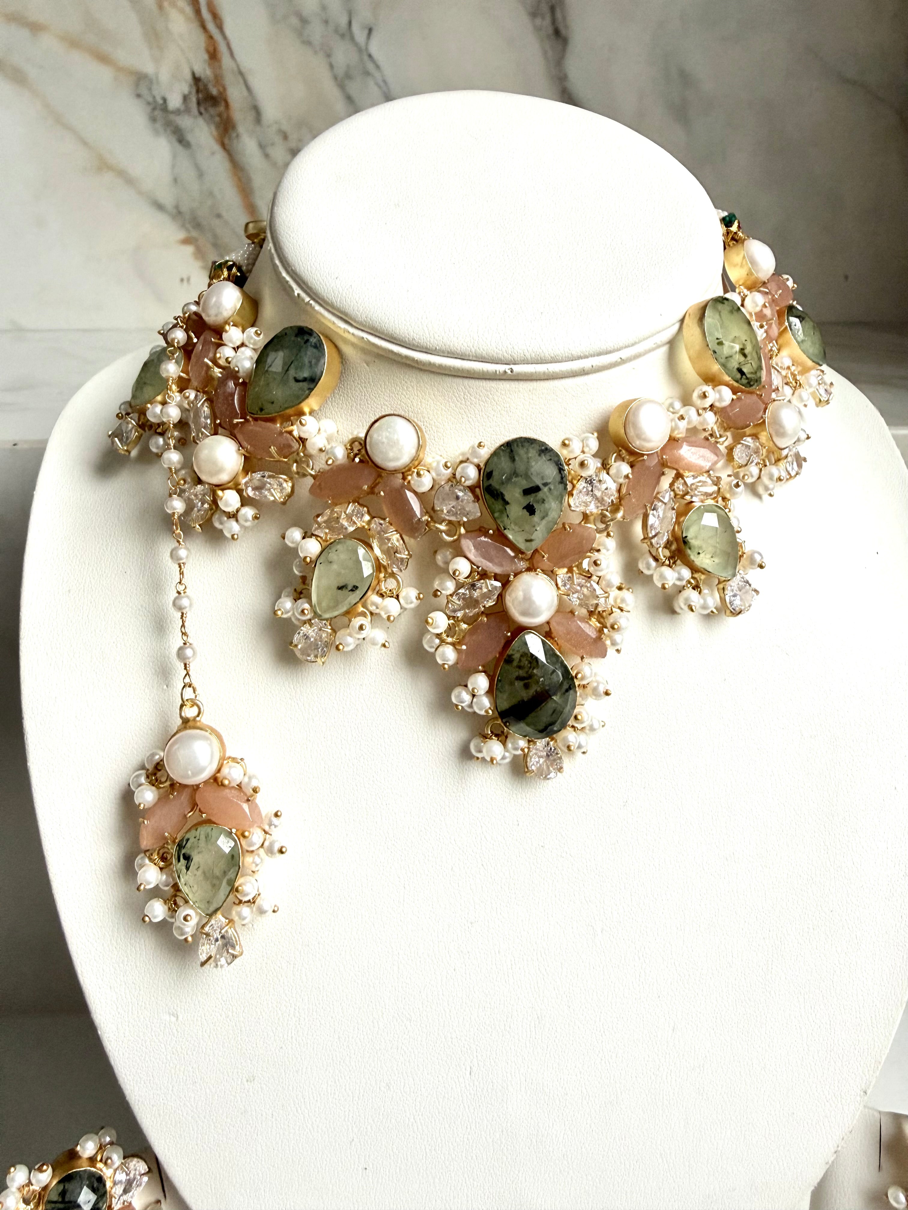 Embrace the enchantment of nature with this exquisite choker set. It beautifully combines earthy prehnite gemstones, characterized by their unique inclusions, with delicate peach stones. The design is further enhanced by luminous pearls and brilliant American diamonds, all meticulously arranged in a radiant gold-plated setting. This complete ensemble, featuring a choker, matching earrings, and a maang tikka, is perfect for a sophisticated and distinctive look."