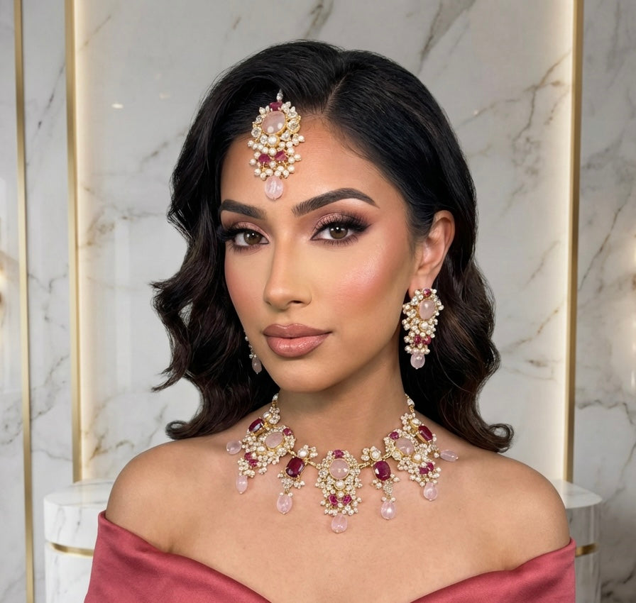 The Amara Luxury Quartz Set features exquisite drop stones paired with a stunning tika. This set is designed to enhance elegance and sophistication, making it ideal for special occasions. Its use of high-quality quartz provides a durable and visually appealing accessory that complements various styles.