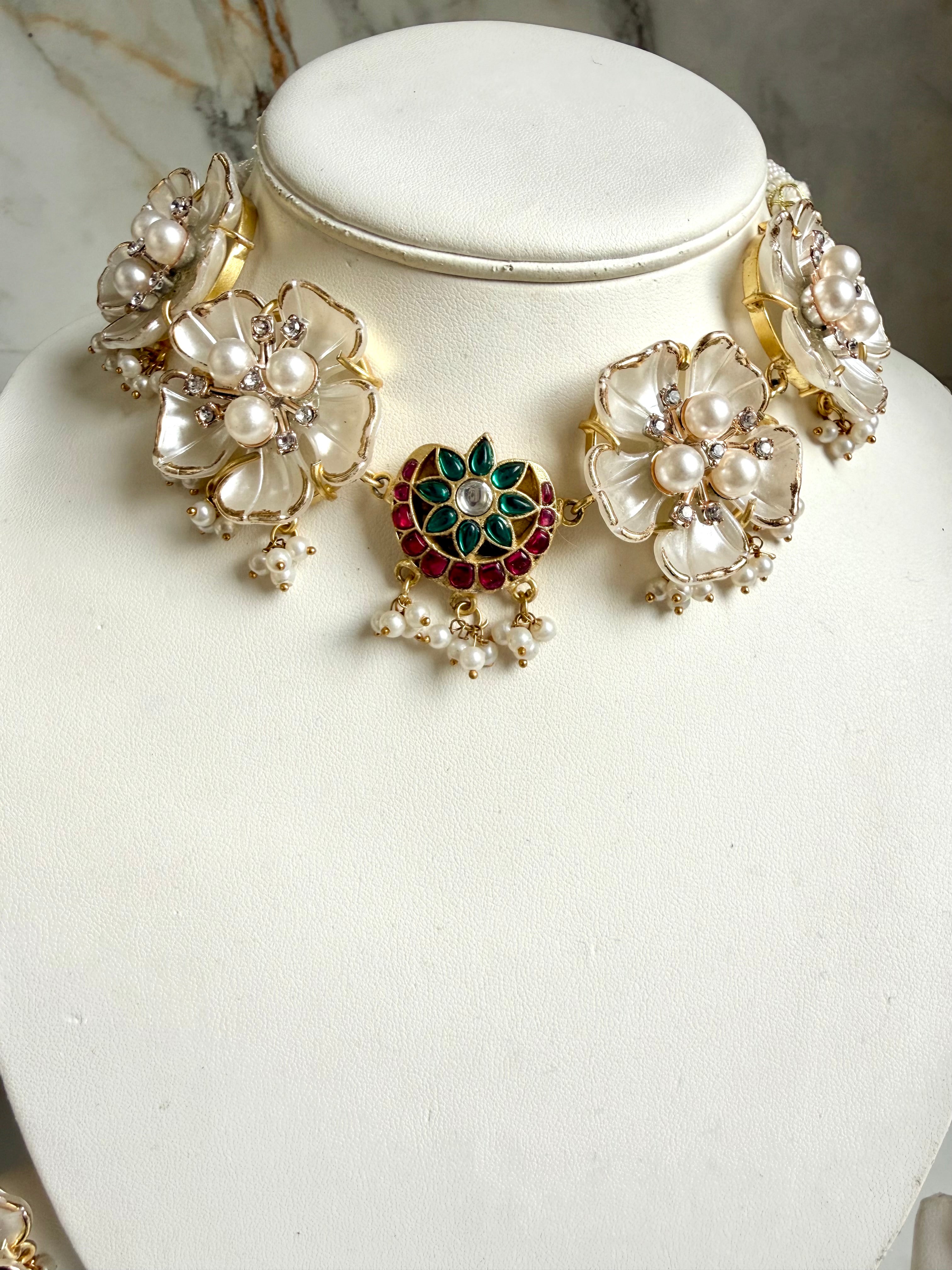 The Flower Set includes elegant white earrings and a choker, accentuated by a vibrant center feature. This combination not only enhances personal style but also offers versatility for various occasions, making it a valuable addition to any jewelry collection.