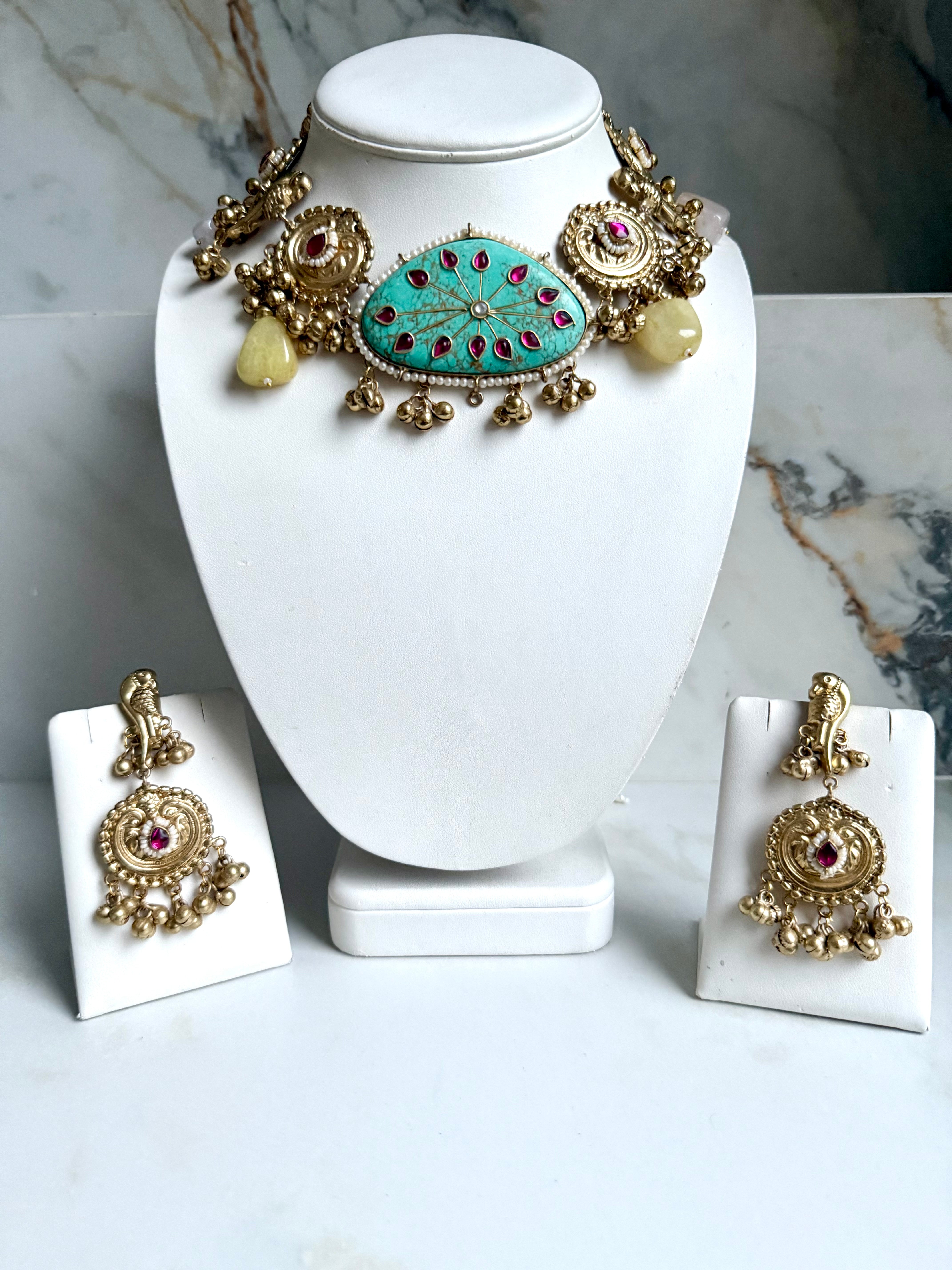 Experience luxury with the Heera  Set. This regal set boasts stunning gold beads that create a beautiful ring with movement. Elevate any outfit with this elegant and timeless piece.