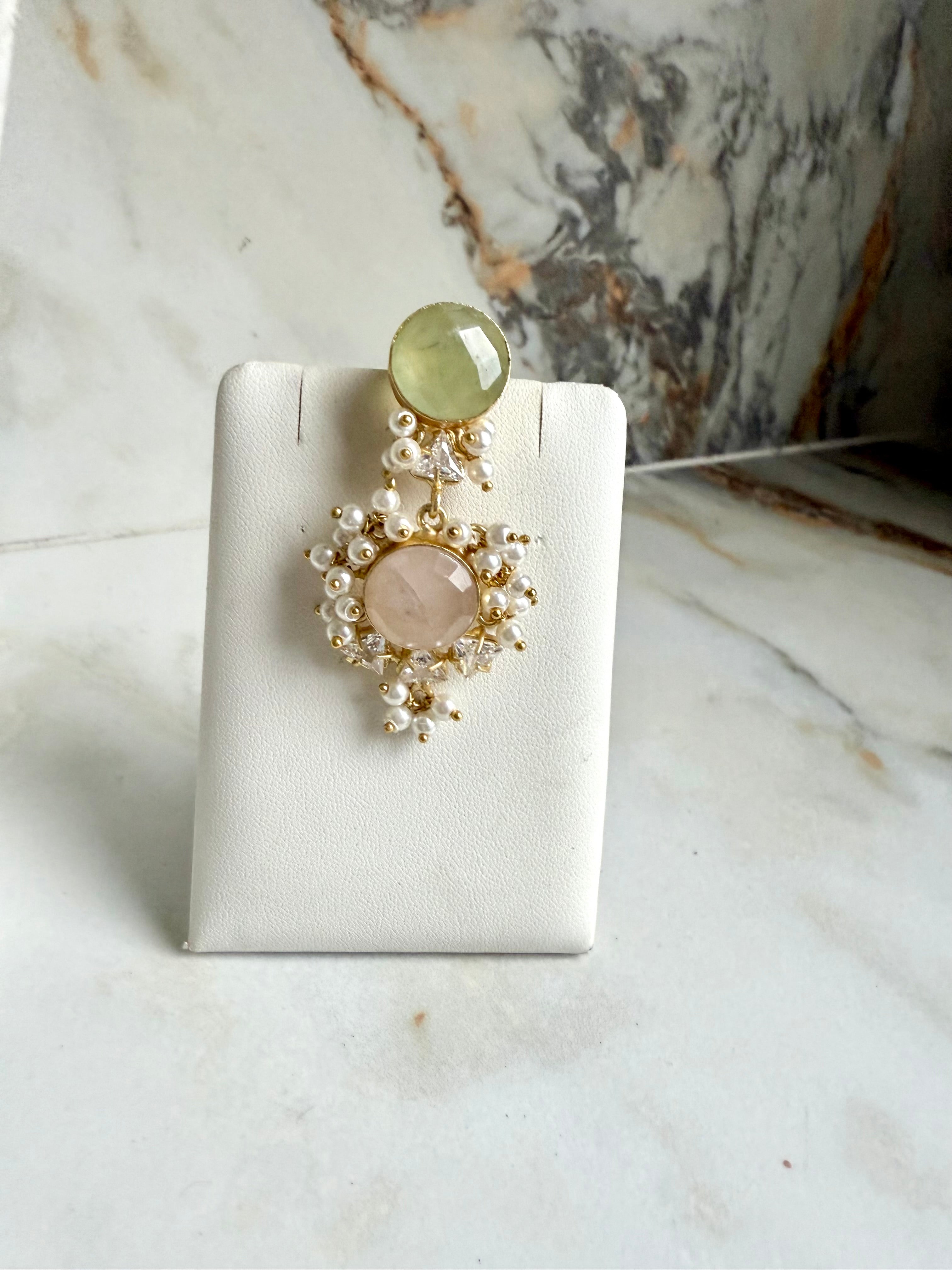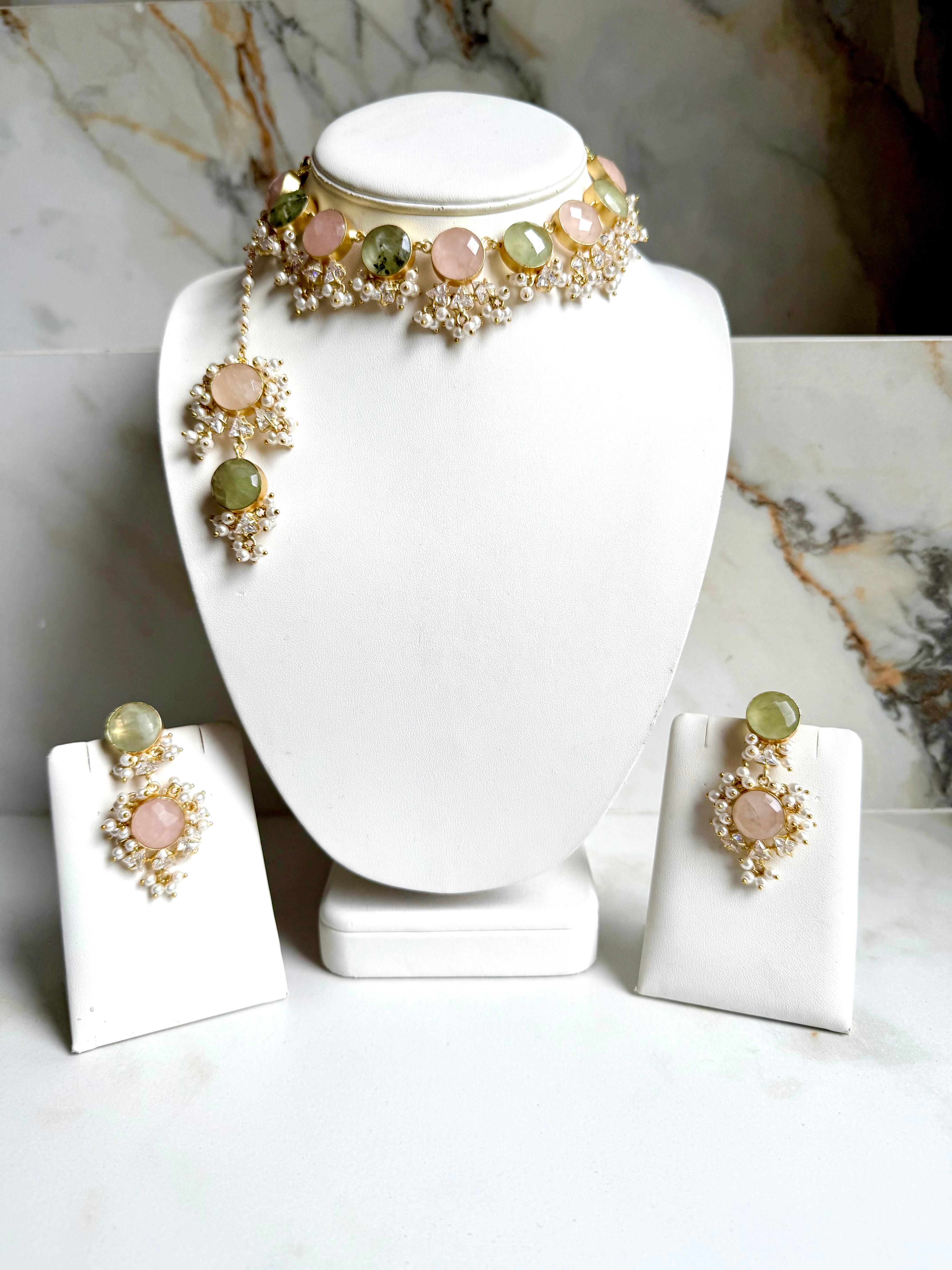 This Iyzah Quartz & Prehnite Set features a beautiful, sparkling quartz stone that will add a touch of elegance to any outfit. The set is perfect for any occasion and is sure to make a statement. Stay on-trend with this timeless piece.
