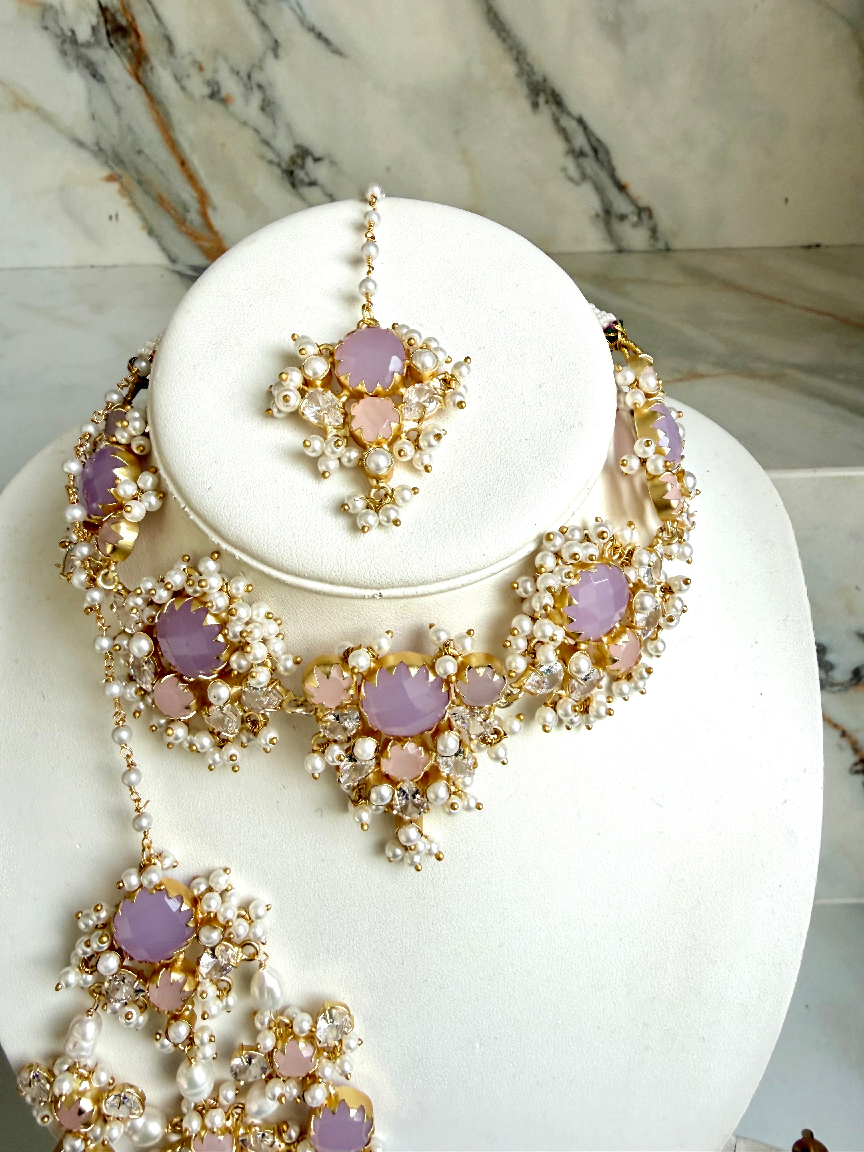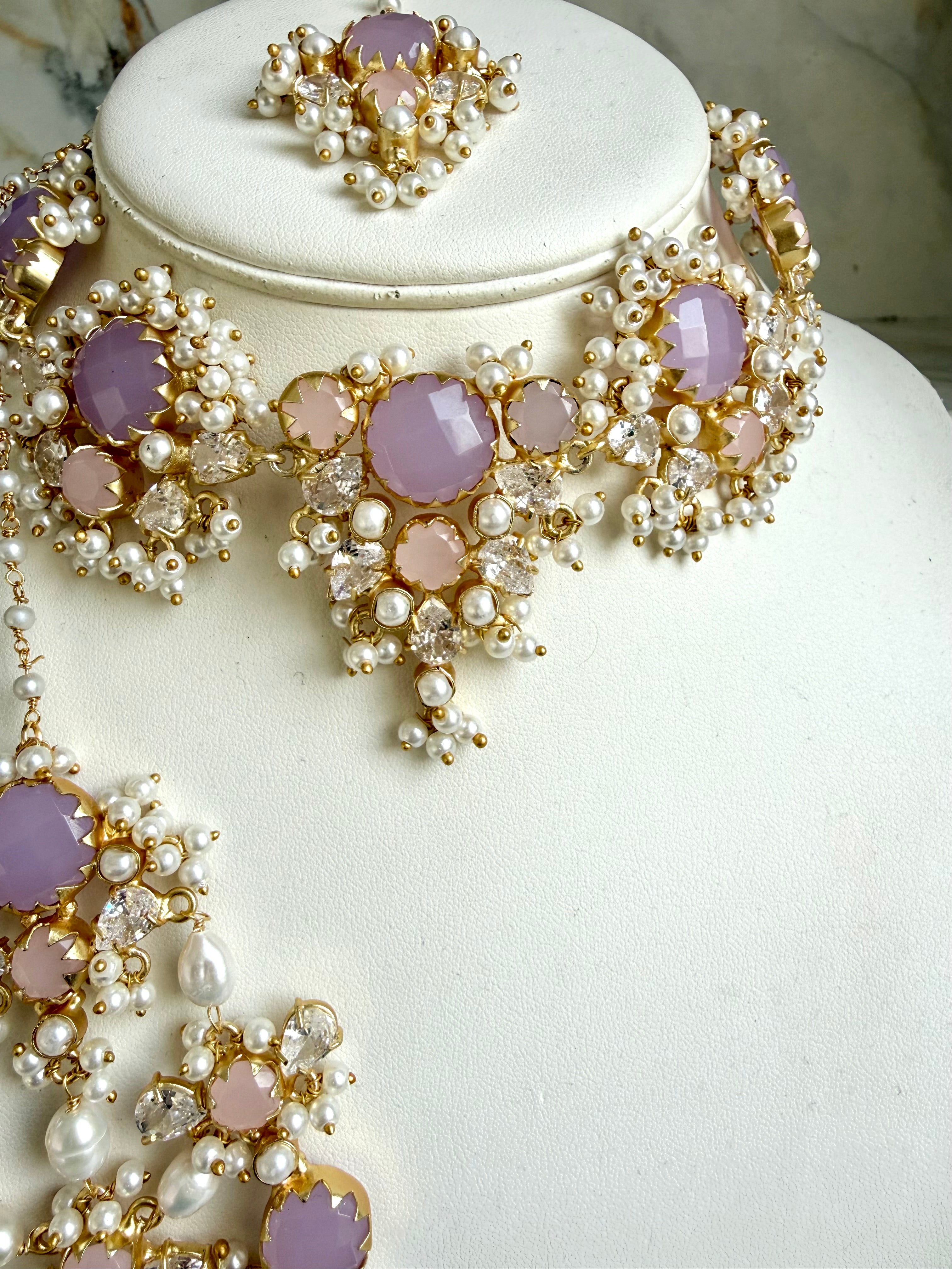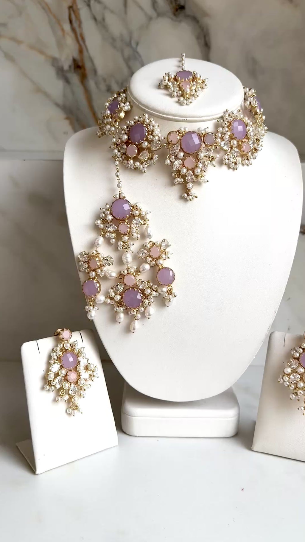 A delicate fusion of romance and regal elegance, this Set features soft lilac stones framed with intricate work and clusters of luminous pearls. The choker-style necklace sits gracefully along the neckline, adorned with floral motifs and shimmering crystal accents that enhance its royal charm.