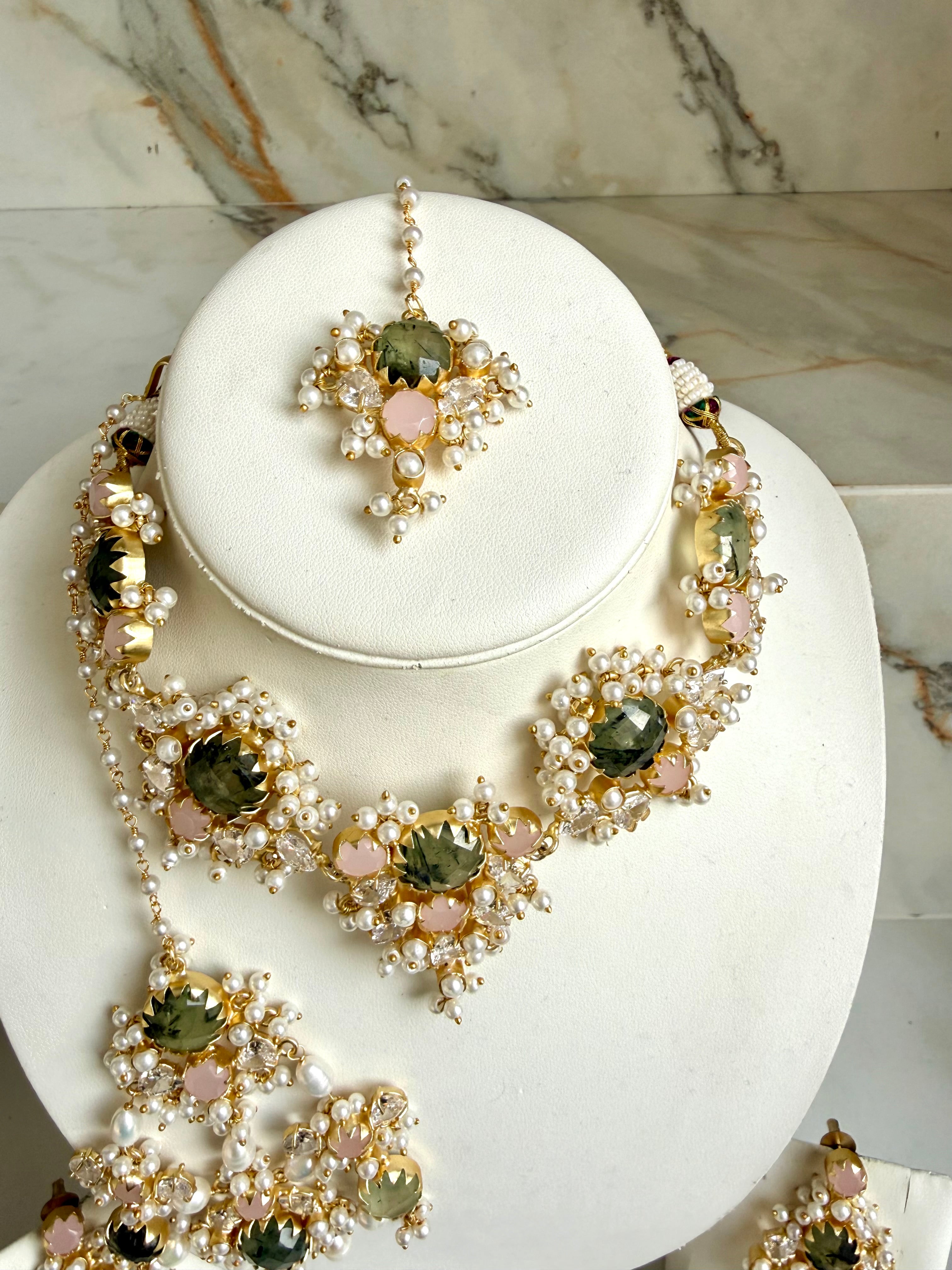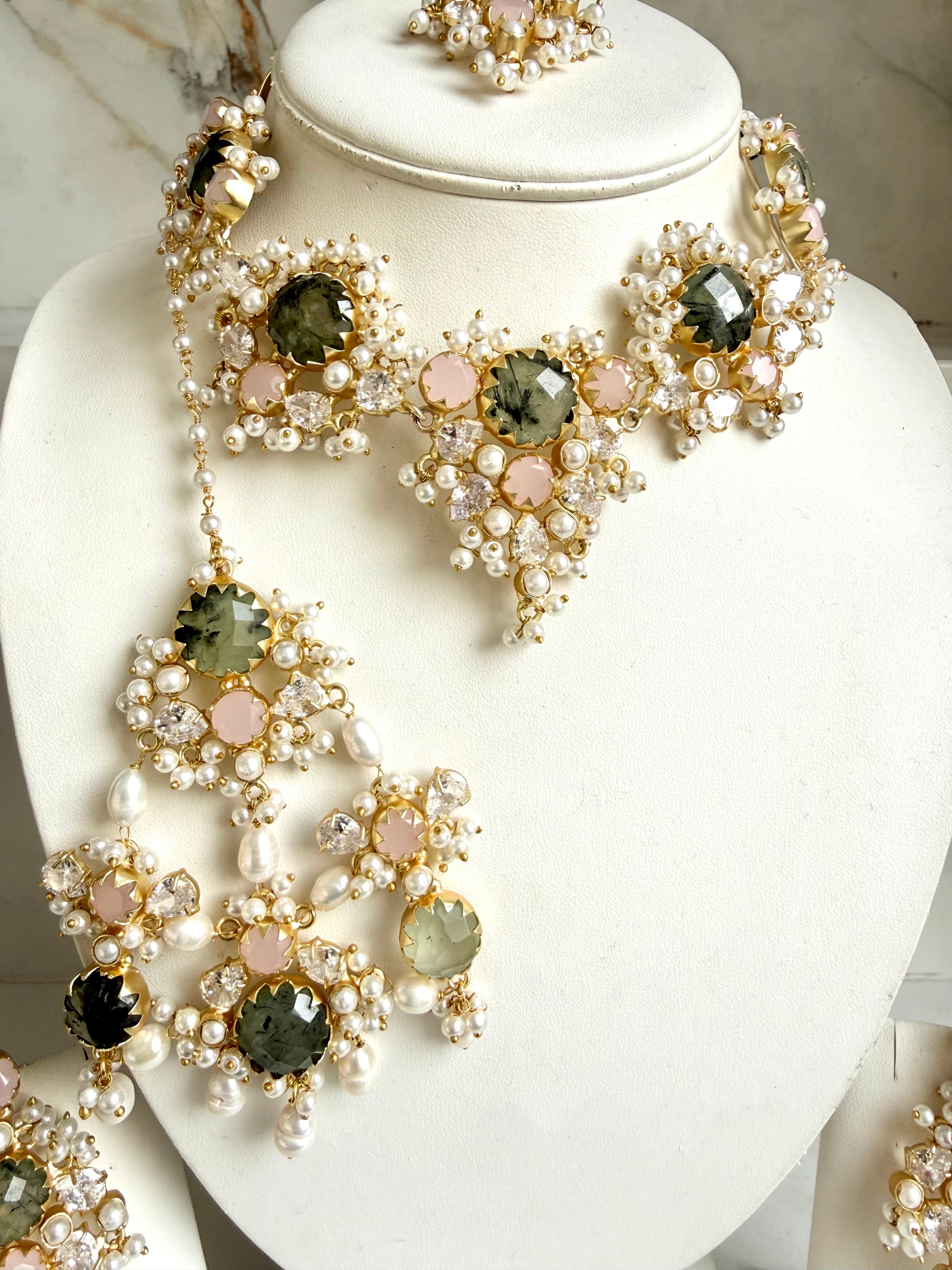 A delicate fusion of romance and regal elegance, this Set features soft prehnite stones framed with intricate work and clusters of luminous pearls. The choker-style necklace sits gracefully along the neckline, adorned with floral motifs and shimmering crystal accents that enhance its royal charm.