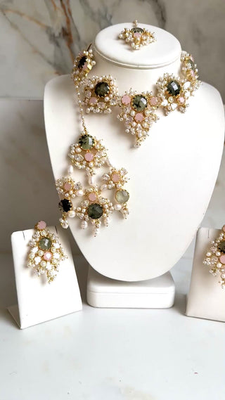 Paired with statement earrings, a coordinating tikka, and an elegant pasa, this set is designed to create a complete bridal or festive look. The soft pink tones combined with gold and pearl detailing make it perfect for weddings, receptions, and special celebrations where timeless beauty meets modern sophistication.