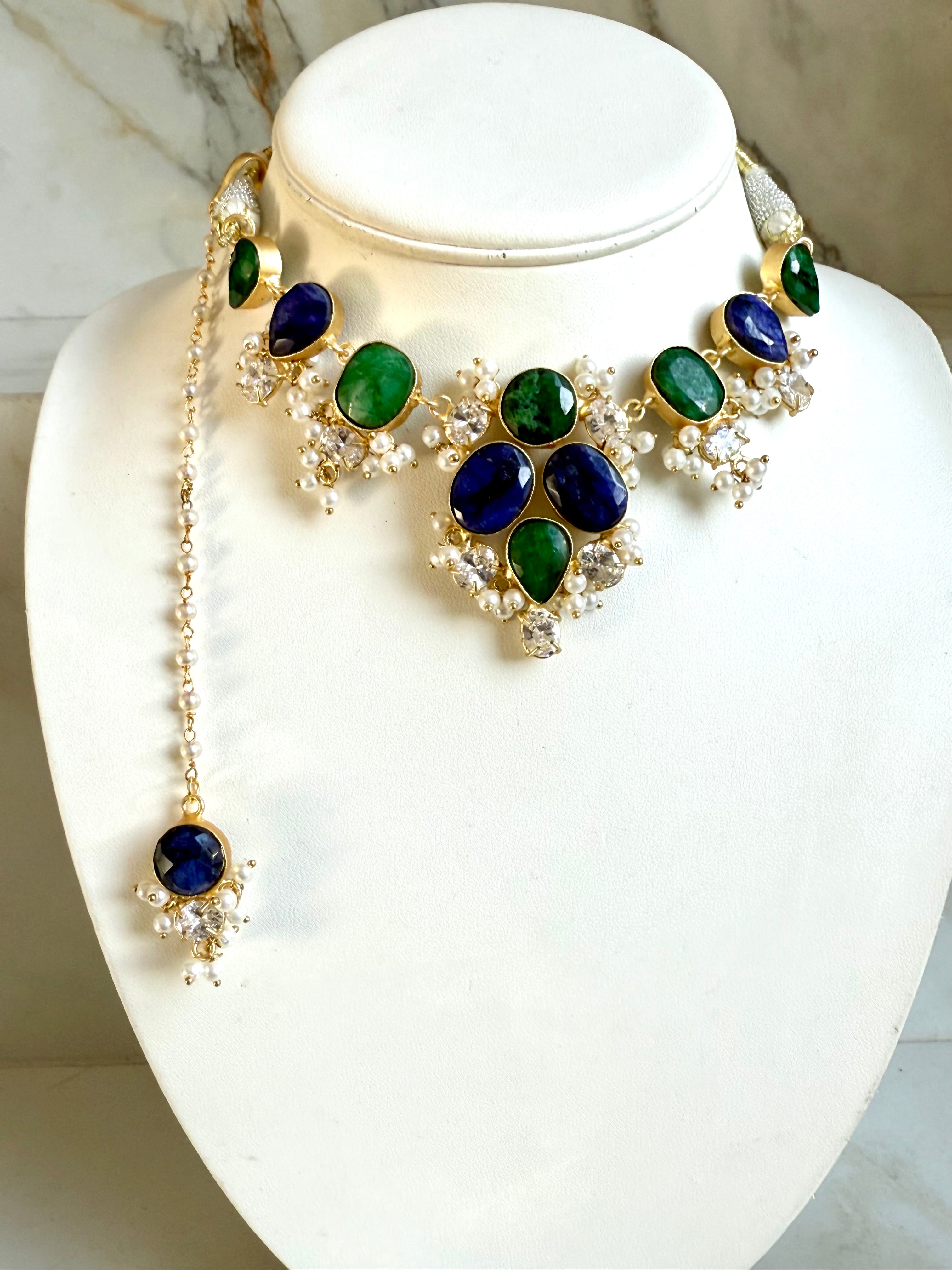 This stunning Emerald Set boasts a gorgeous central drop and timeless crystals for a wow factor. Perfect for any occasion, pairing the tika and earrings will elevate your look or simply wear them without the necklace. Expertly crafted with top-of-the-line materials for a luxurious and unforgettable experience.