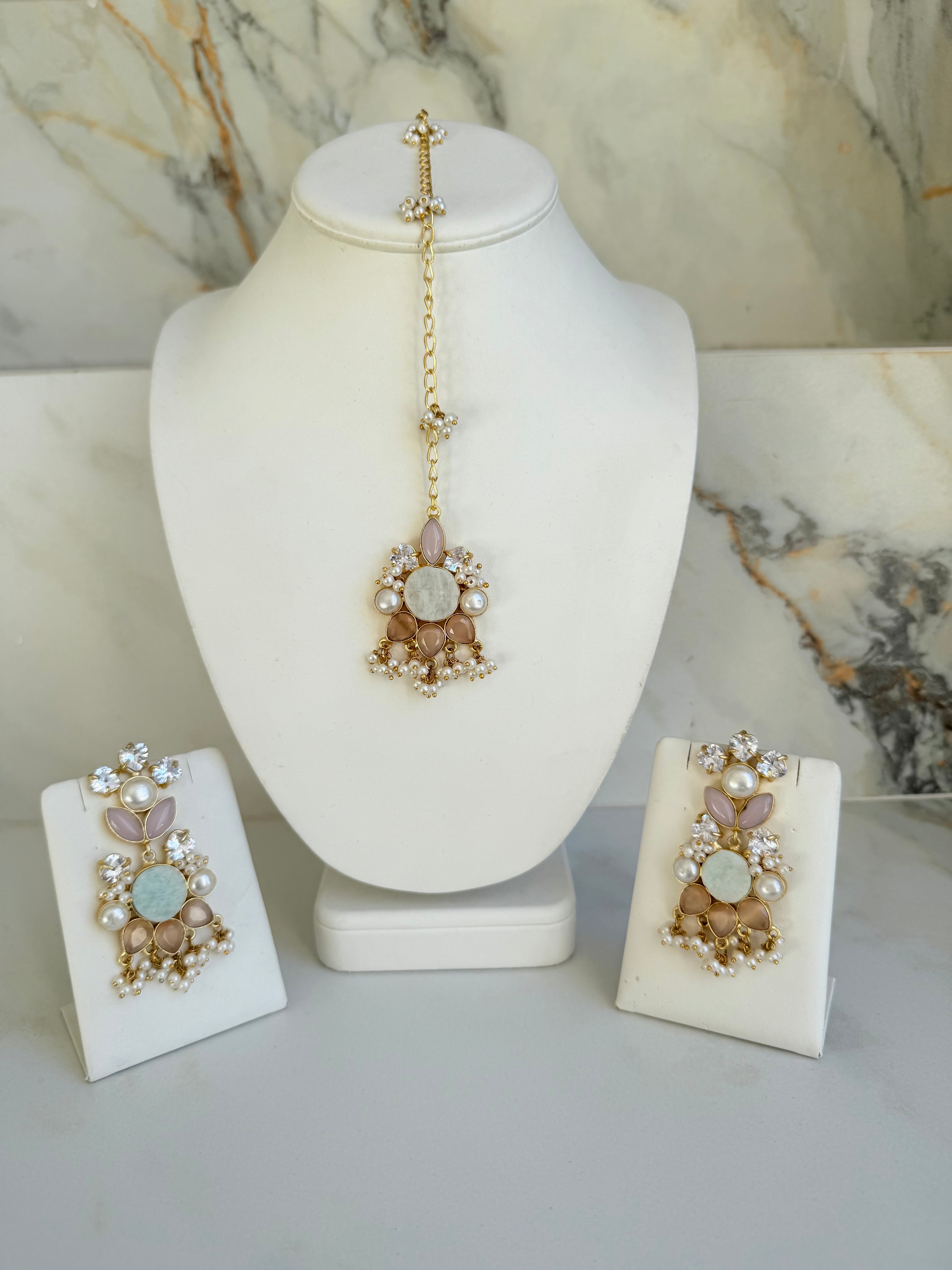 This set of druzy tikas in a gorgeous soft mint color is the perfect complement to any outfit. The druzy stones add a touch of elegance and sparkle, while the soft mint color adds a subtle pop of color. Elevate your style and make a statement with the Druzy Tika Set.