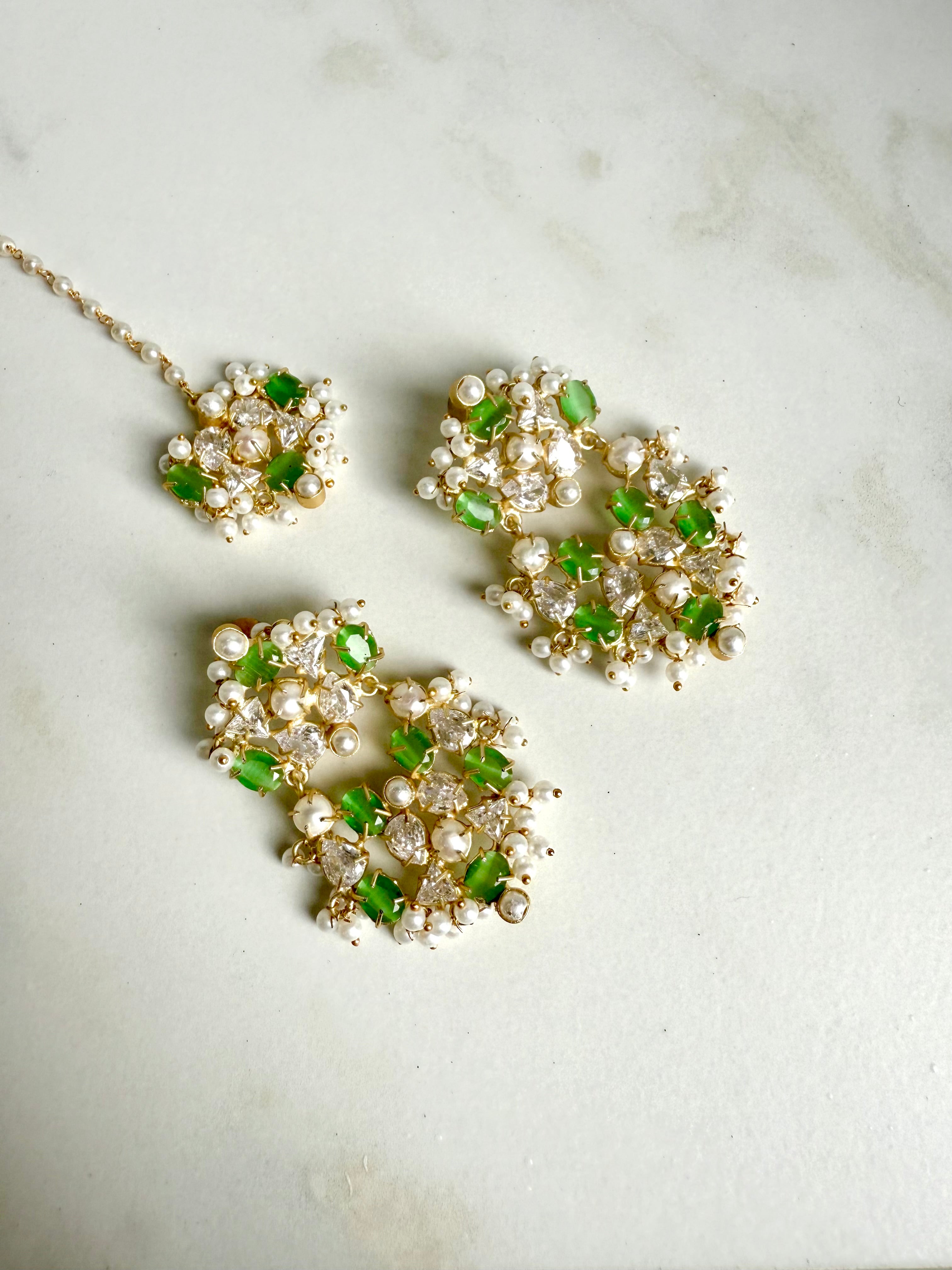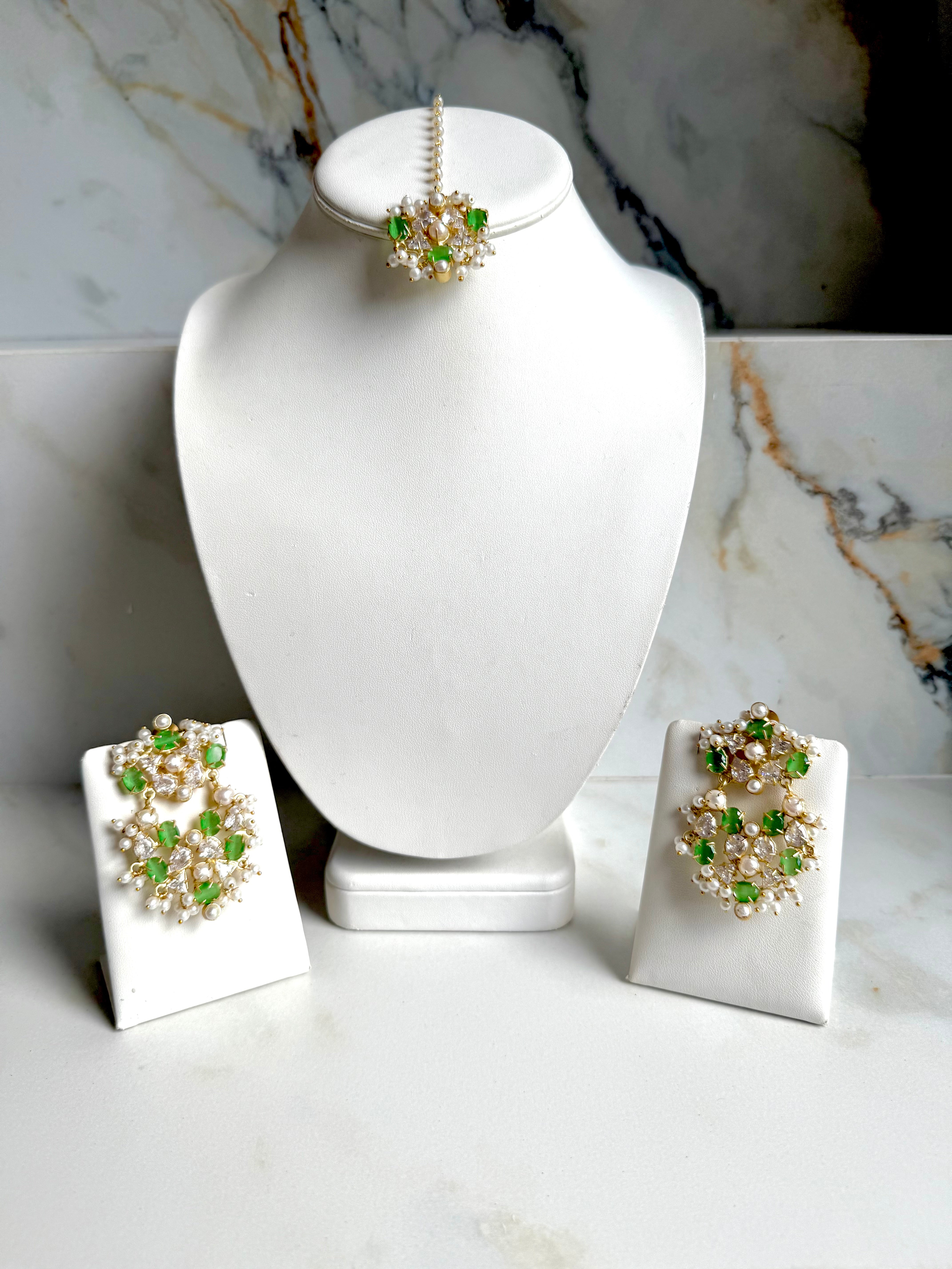 The Mughal Green quartz & Pearl Tika Set offers a gorgeous and intricate design, perfect for the upcoming wedding season. With a classic style, this set is sure to make a statement and provide elegance for years to come. Add a touch of tradition and beauty to any outfit with this stunning tika set.