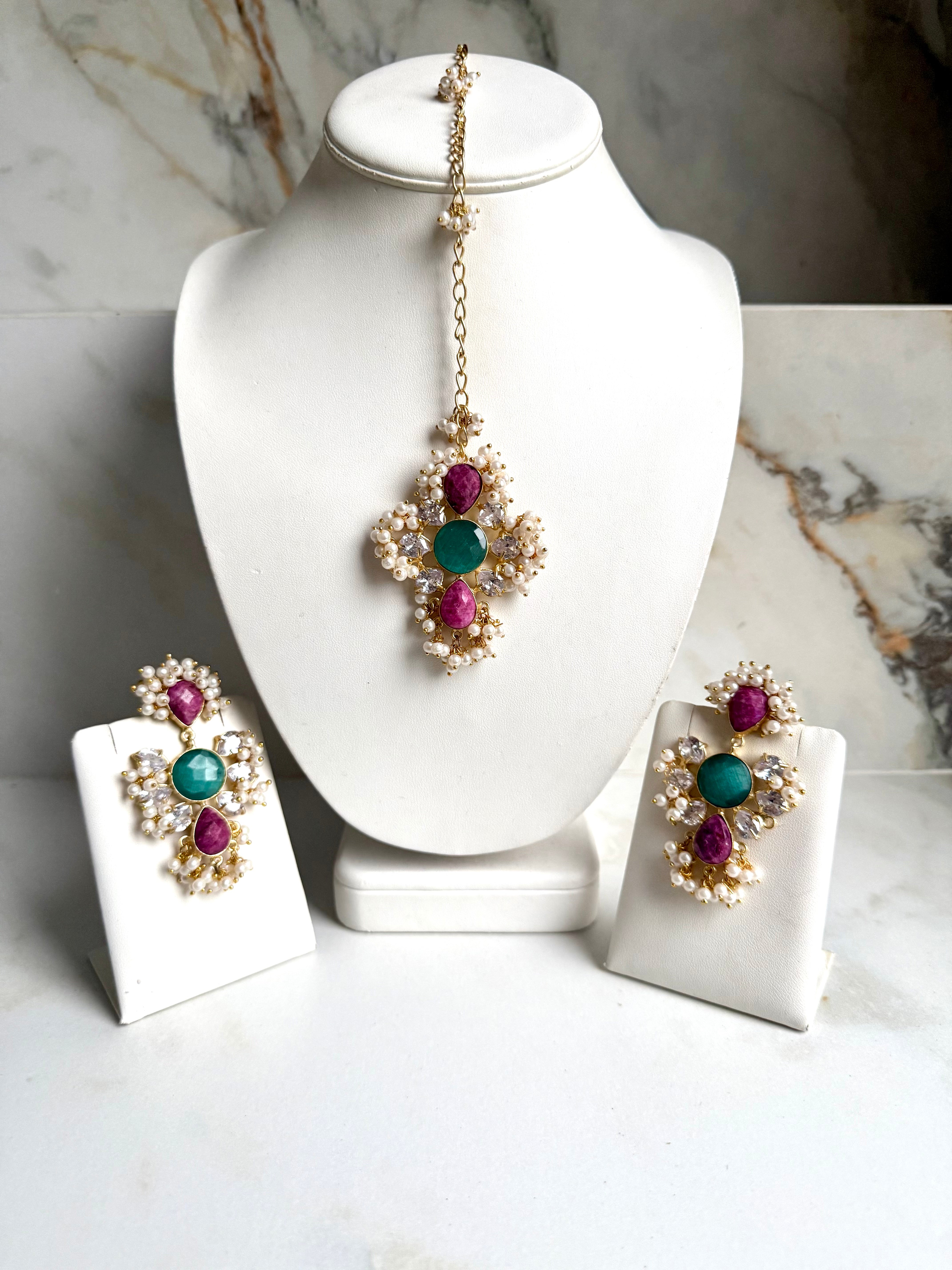 The Ruby & Teal Tika Set features a beautifully designed tika, which serves as a traditional forehead ornament. This accessory can enhance cultural attire, providing a striking visual focal point. Its color combination of ruby and teal offers versatility for various occasions, adding an elegant touch to formal wear.